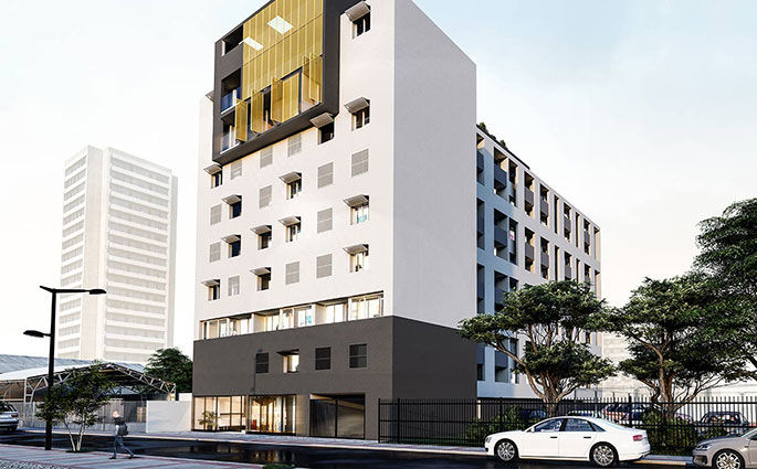 Para darle forma a un proyecto contemporáneo en pleno centro cívico de Santiago, nos contextualizamos con el barrio del paseo Bulnes, un sector institucional, desarrollando una fachada en tres tiempos, a la manera clásica: zócalo, cuerpo y coronación. Sin embargo, reinterpretamos la coronación, transformándola en la singularidad de la propuesta, en lo nuevo y contemporáneo.